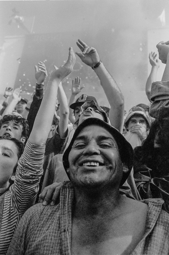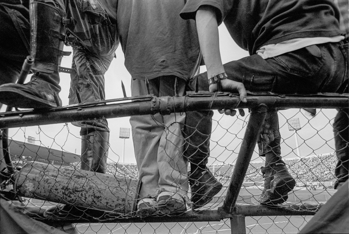 JG: Sí. Es porque soy muy parte de este capítulo. Uno más dentro de un lote. Tampoco es que tuviera mucha alternativa de distancia. Estás metido en una masa. En un espacio en el cual estás rodeado, que no te permite hacer mucho juego de movimiento. Y además quería que eso fuese relevado más abiertamente junto con los demás: ser uno más de los que están en la gradería. Ese es el sentido de estas fotos. Pero también es como hago fotos, porque me gusta que la gente participe. En este caso que participe la multitud. No hago un foco tan selectivo.