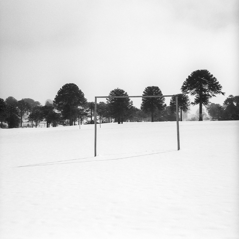 JG: Ahí la noción de territorio era lo que yo quería relevar, para que el espacio hable de sujetos y territorio. Y se insinúa a las personas todo el rato, desde las piedras, en los objetos que hay en las canchas, el pasto o la no existencia de pasto, o en la nieve. En el paisaje está insinuada o sugerida la presencia de las personas y el entorno te habla de esas personas. Y hablar del paisaje de un país tan diverso en términos geográficos y también económicos y sociales. Por eso hay canchas de mineras metidas en las forestales, o canchas en el borde costero. En todos los lugares hay una cancha, ya que todos tienen ese espacio como sacrosanto de diversión o de esparcimiento, de entretención del fin de semana. Es un ritual. Lo que me gusta del fútbol es el fenómeno ritual y social al que está asociado.