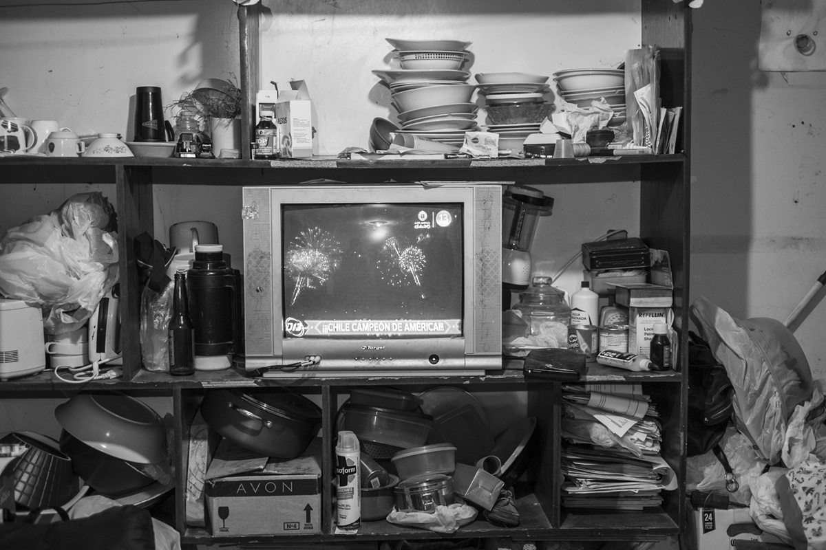 CHA/EC: En “La Roja”, que viene a ser la segunda parte del fotolibro, se muestra, en contraste con lo anterior, el paisaje urbano y casi siempre están los espectadores “capturados” en el acto de ver algún partido de la selección chilena de fútbol.