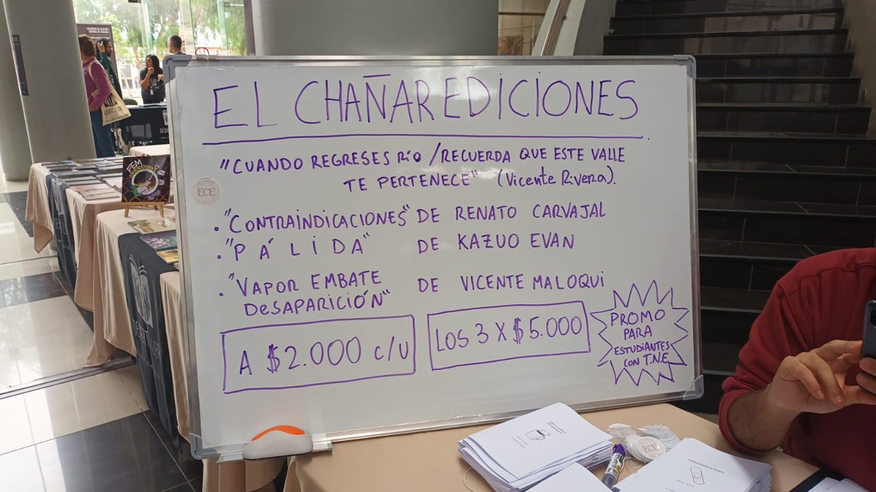La feria inicia unas horas después. Conformada por editoriales locales, se han sumado algunos desde más al norte y desde el sur. Desde esta ciudad al sur. Desde Iquique, un caso, viene editorial Navaja, comandada por Roberto Bustamente. Desde el sur real, Damsi Figueroa trae un surtido de editoriales de Concepción y sus alrededores. Mi misión es el matute desde Valparaíso. Nos ordenamos geográficamente y entonces quedo entre Roberto y Damsi.