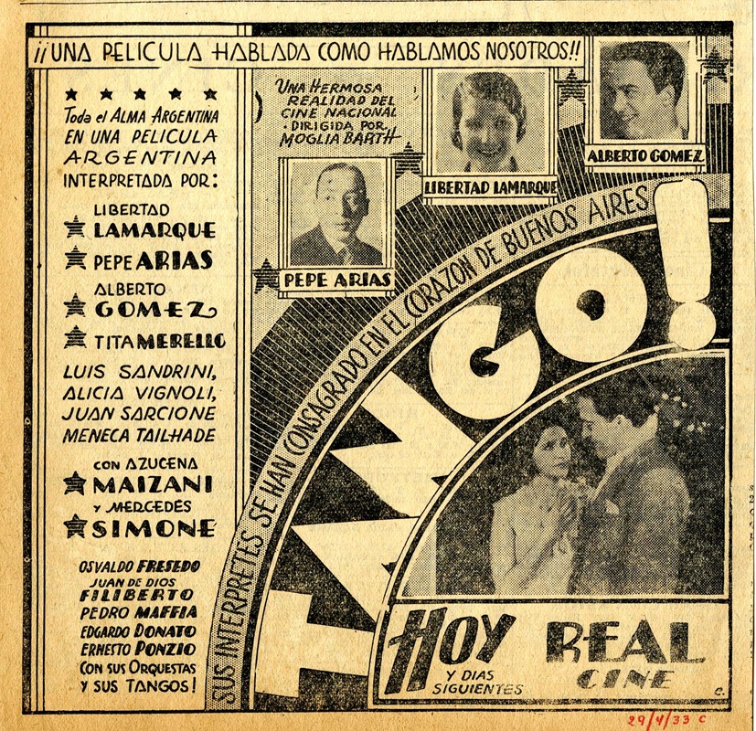 Como en muchas otras cosas, en las primeras décadas del siglo pasado Carlos Gardel fue una figura central en la representación de los argentinos dentro y fuera de su país. Al llegar la tecnología del sonido y dificultársele las cosas a Hollywood, encontraron en Gardel una muy buena forma de intentar nuevas estrategias para mercadear desde el Río de la Plata. En este sentido, los filmes interpretados por este cantante, ambientados en París y Nueva York ‒Melodía de arrabal (1932), Cuesta abajo (1934), El día que me quieras (1935)‒, tuvieron una gran audiencia en toda Latinoamérica.