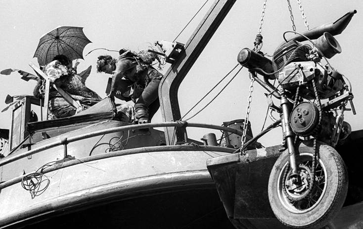 La eficiencia del gesto del colectivo de servidores que destrozaban los automóviles capturados, triturándolos y cortándolos a la vista del público, se percibía como una danza frenética y delirante. Luego la parsimonia se instalaba cuando estos trozos eran servidos en grandes y decorados platos a esta mujer/barcaza, que, al comerlos, crecía.