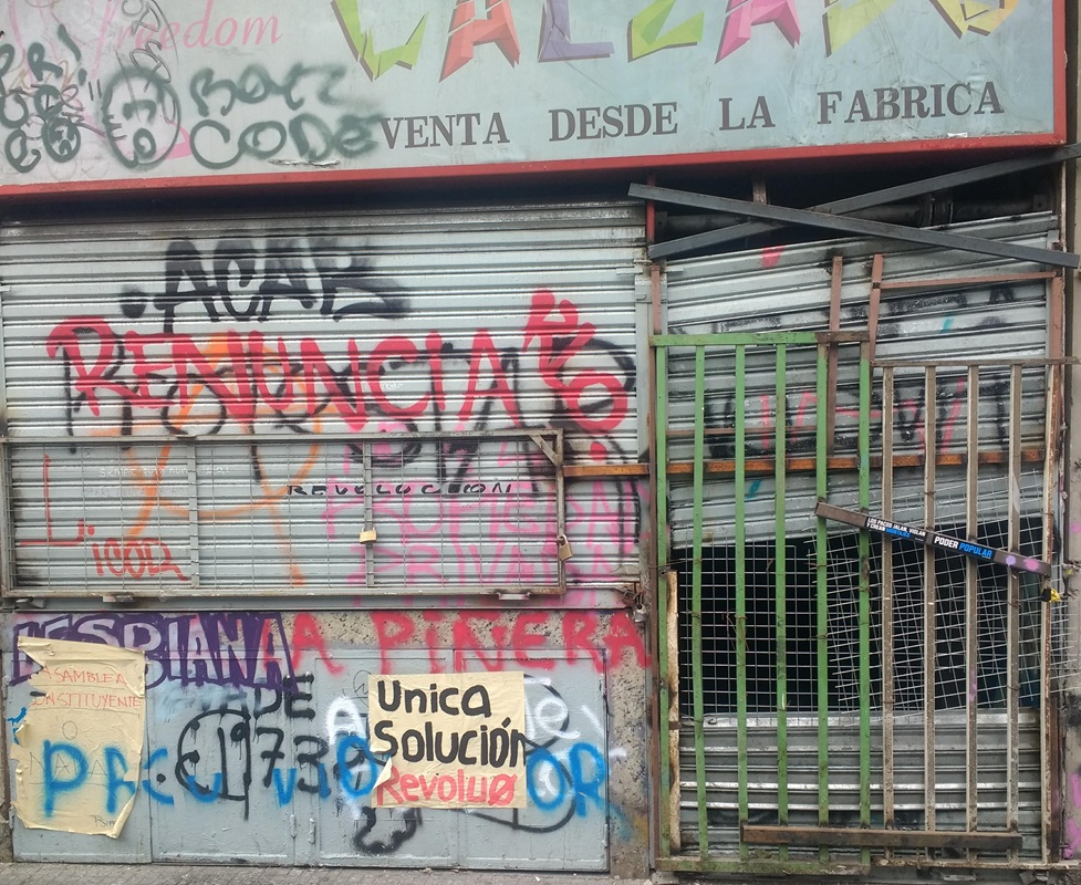 Matapacos vive. Chile será la cuna y la tumba del neoliberalismo. Nadie + sin casa. Las amigas cuidan los pacos violan. ¡Viva la pesca artesanal! Terrorismo de Estado. A.C.A.B. Nos están dejando ciegos. Piñera: mi hijo de 6 años cree que no fuiste al jardín, porque no sabes escuchar. Gracias, juventud. No es sequía es saqueo. 1312. No + Abusos. No + Muerte. Hemos vuelto a querernos. DIGNIDAD. Ríos libres. Lo que hacemos en la vida resuena en la eternidad. Chile es su pueblo. Sigamos escribiendo nuestro futuro. Llevo 86 años siendo explotada. Brigada antiyuta. Qué alegres son las obreras. ¡Fuera dictador! El agua vale más que el oro. Lucha como la Gladys. NI PERDÓN NI OLVIDO. Sin rendirse. ¡arde! Corte de ruta y asamblea. Piñera asesino. Y k pza. En Kayser los mataron y los quemaron. La Parada Militar cuesta 300.000.000. Nos organizamos o desaparecemos. La memoria salva vidas. Evade a tu familia pinochetista. MUERTE A LA PAZ (9).